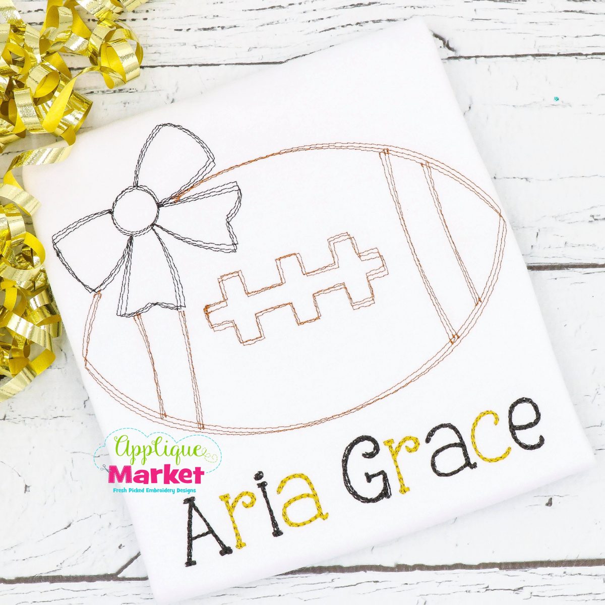 The Football Bow Doodle embroidery design listing includes five sizes for a wide array of hoops: 4×4, 5.0, 6.0, 7.0, and 8.0 inch. This is a doodle style finish with embroidery only; there is no satin stitch or applique.