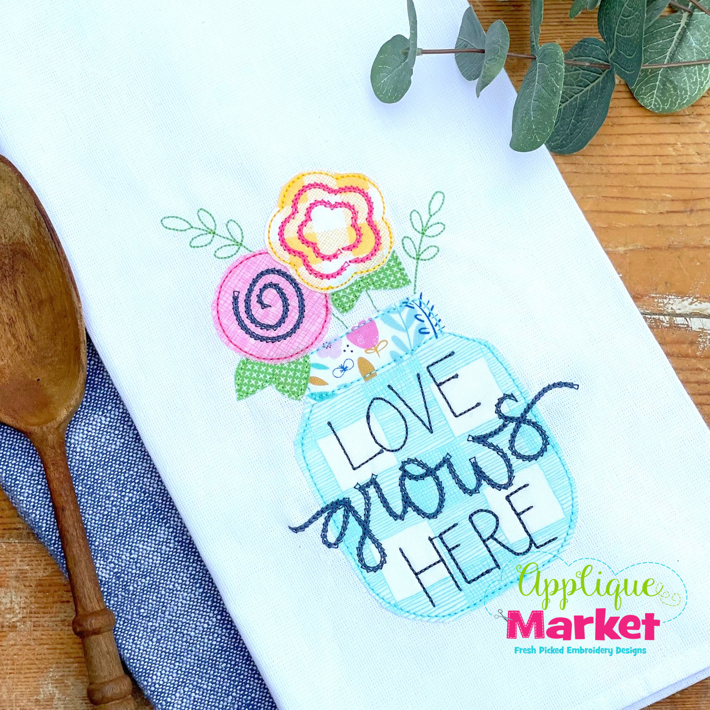 Show your love for home with our Jar Flowers Love Grows Bean applique embroidery design. This design is perfect for decorating your home and is perfect for tea towels, pillows and more.